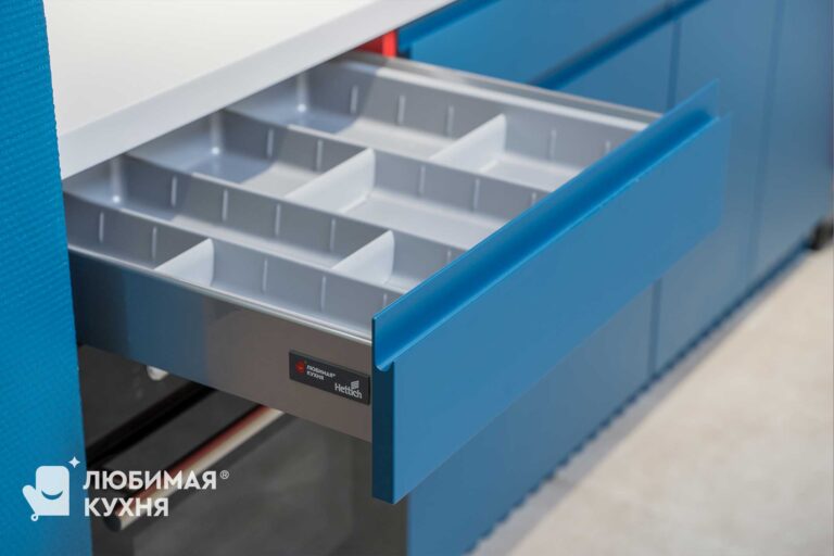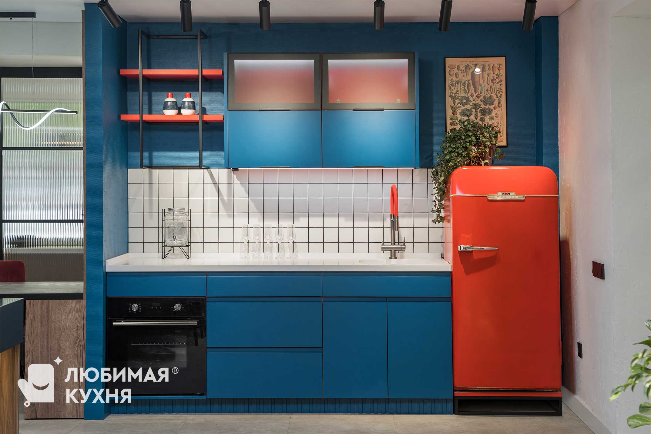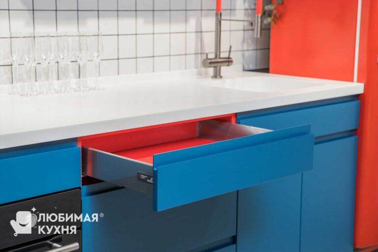 Яркая, стильная кухня — выбор для самых смелых! Фасады цвета индиго с красным корпусом и холодильником — создают невероятное сочетание. Для тех, кто не боится добавить в свои будни яркости и уж точно не быть как все!