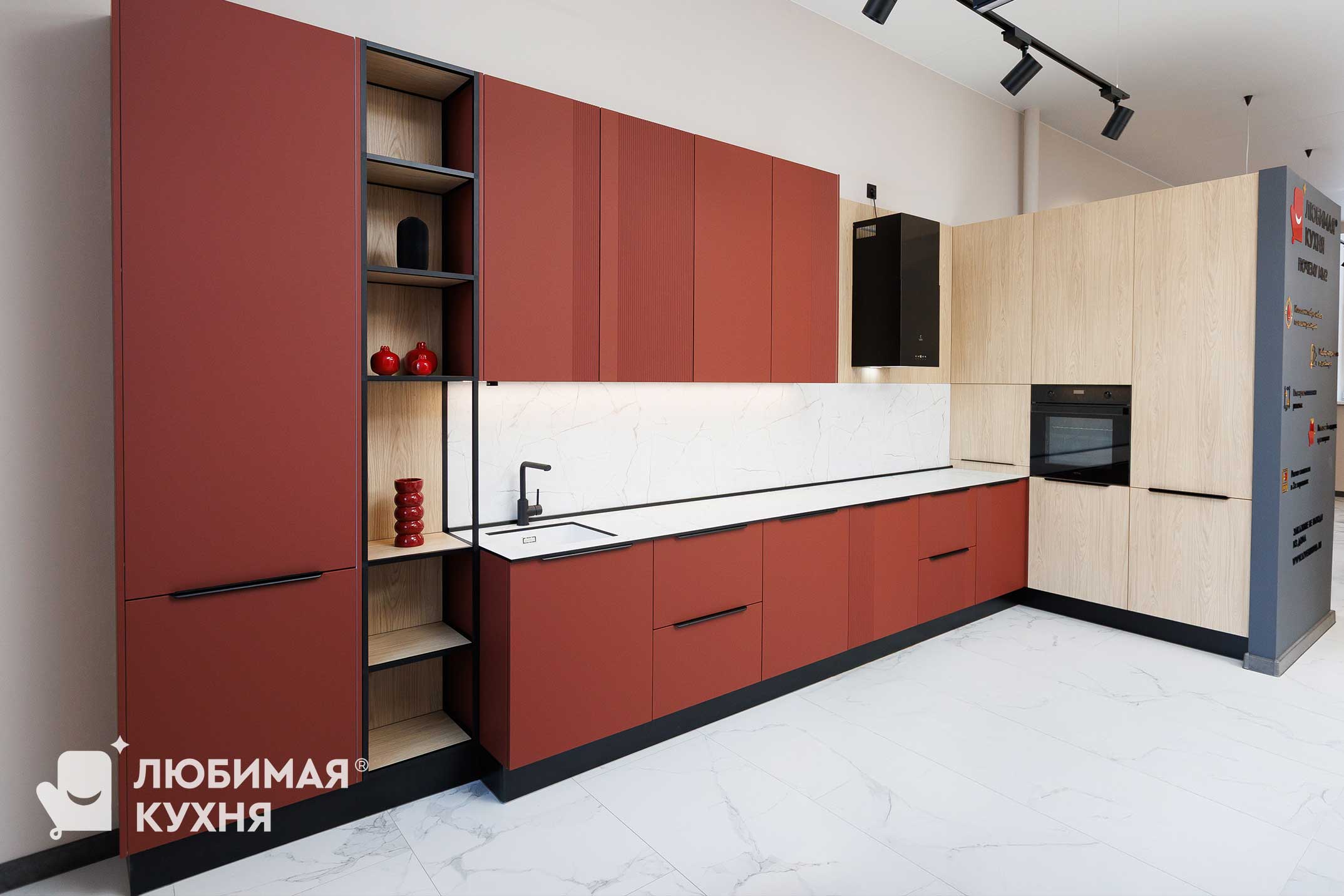 Современная кухня с контрастным сочетанием оттенка бордо и светлых деревянных фасадов. Главный акцент — высокий пенал с открытыми полками в чёрном металлическом каркасе, создающий эффект лёгкости. Фартук и столешница из белого мрамора с серыми прожилками гармонично связывают композицию. Чёрные ручки-профили, смеситель и бытовая техника подчёркивают графичность линий. Трековое освещение и минималистичный дизайн делают интерьер функциональным и стильным.
