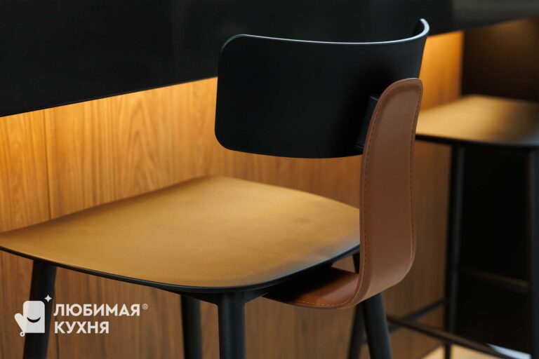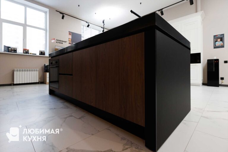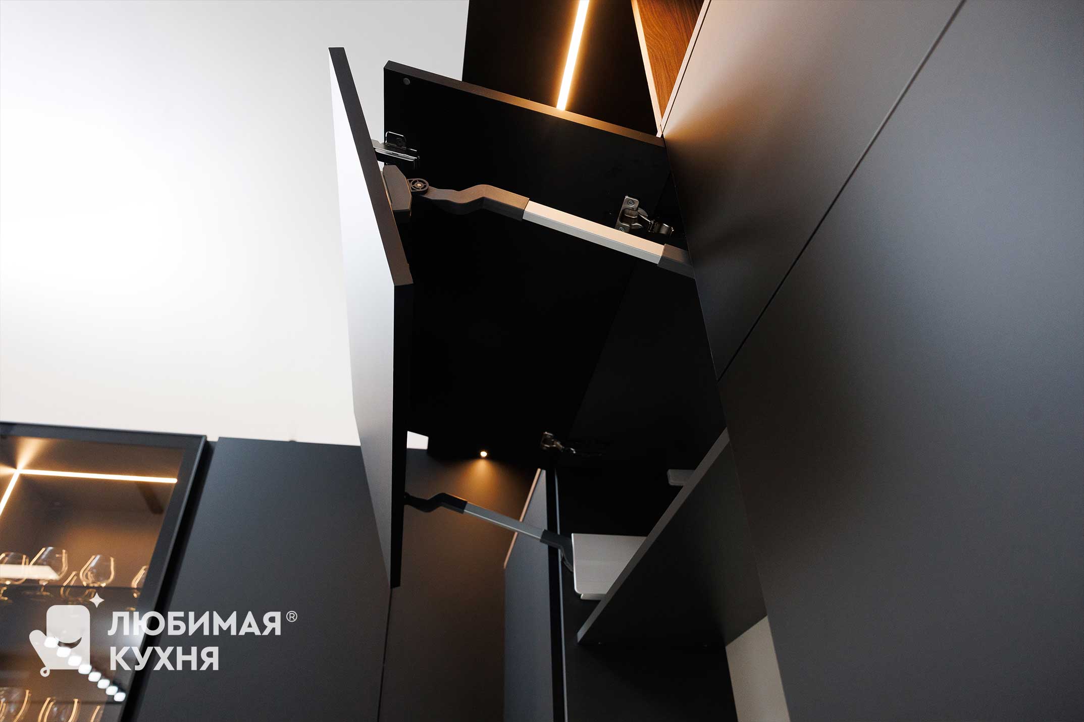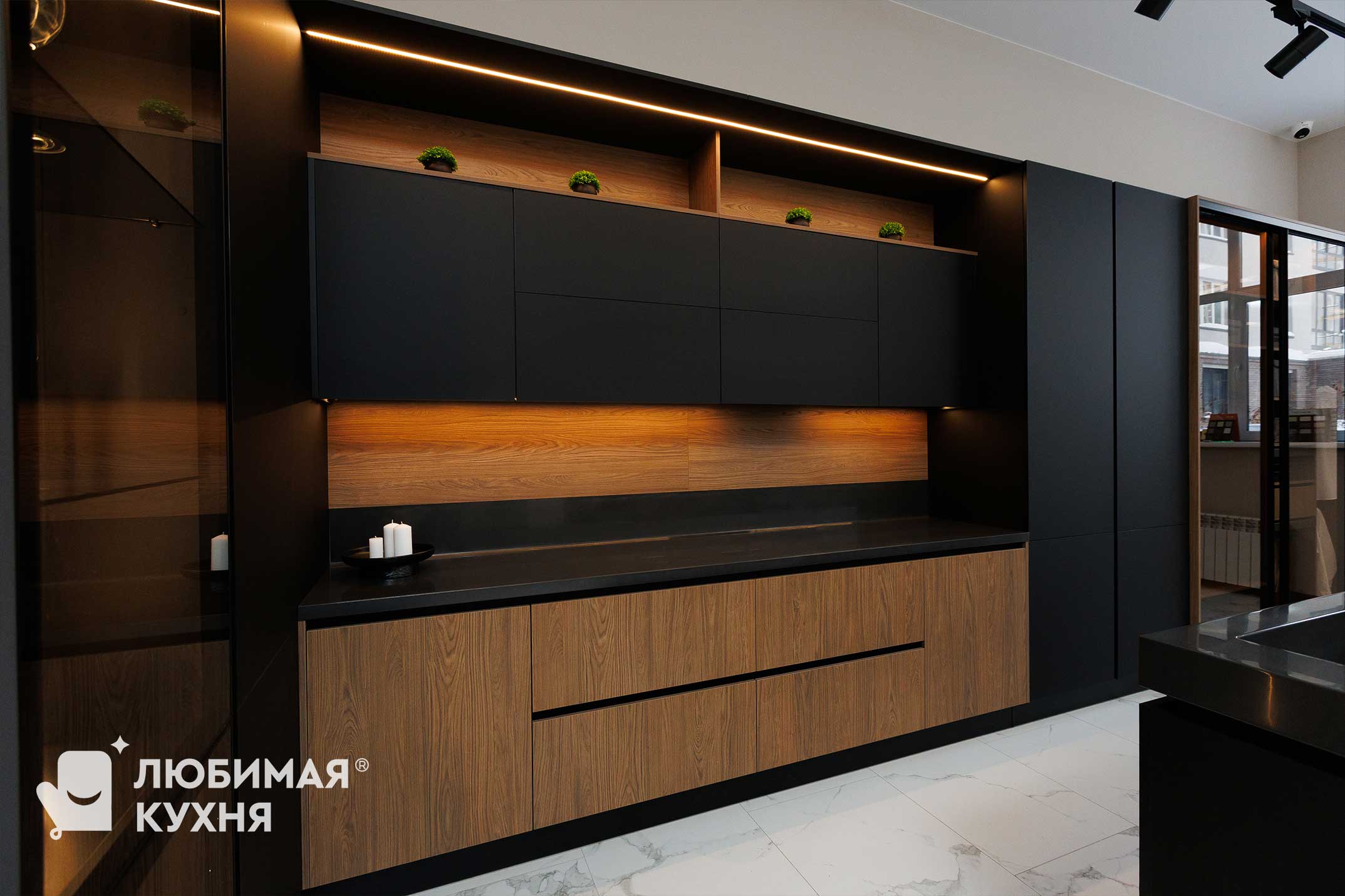 Кухня выполнена в современном минималистичном стиле с акцентом на контраст фактур и света. Матовые тёмные фасады сочетаются с тёплым древесным оттенком, создавая уютную и статусную атмосферу. Открытые ниши с декоративной подсветкой добавляют глубину и визуальную динамику, подчёркивая архитектурность композиции. Лаконичные формы и скрытые ручки делают интерьер строгим, стильным и функциональным.
