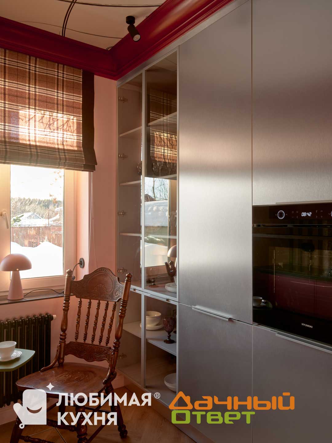 кухня Slotex 0114/8Bordo, пеналы Slotex 97026/BR Satin Silver| Алюминиевая рама серебро, стекло прозрачное опти вайт, шкафы Slotex 7606/S Lotus