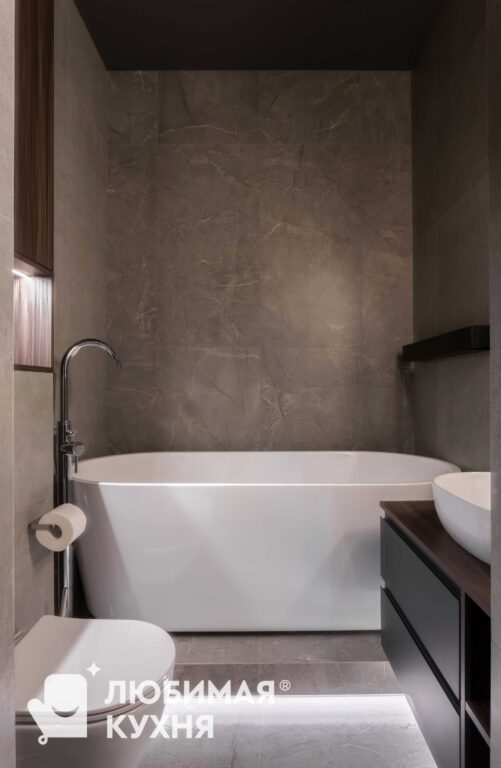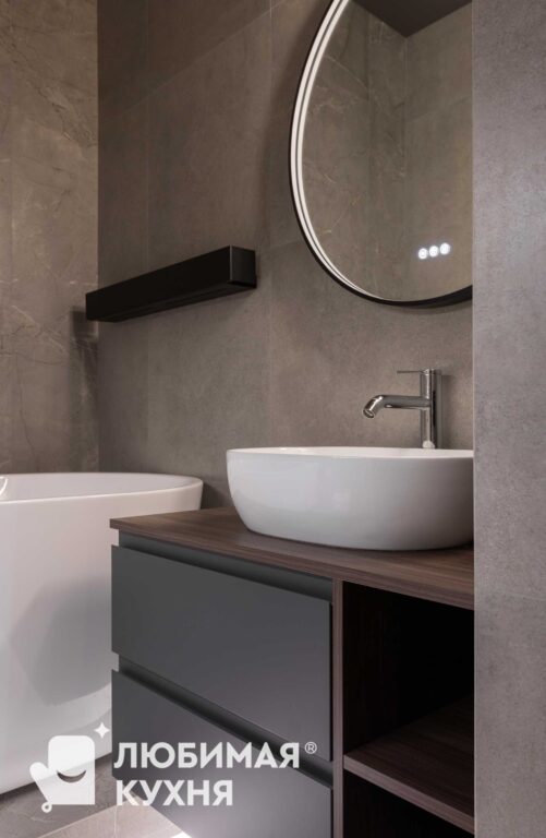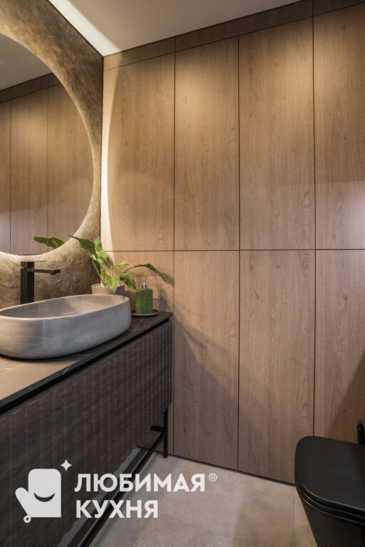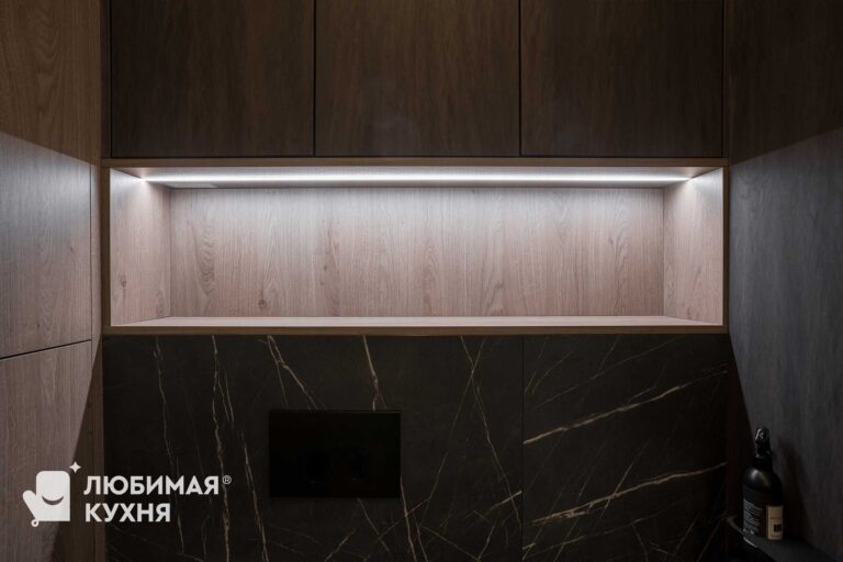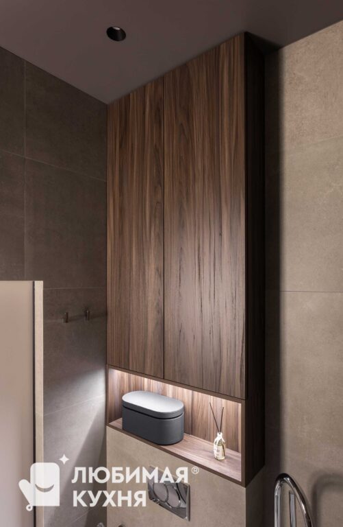 Искусство утонченного минимализма. Серо-коричневые матовые фасады шкафов создают монолитное пространство, сливаясь со стенами. Удобные и стильные ручки, которые вырезаны в фасадах и создают дополнительный ритм. Фишкой данного шкафа является его подвесная конструкция, которая образует пространство под шкафом с подсветкой для размещения обуви.
